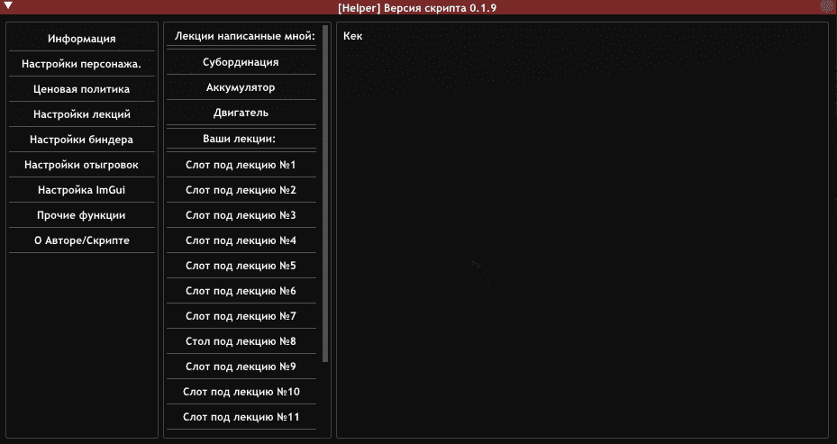 Добрый вечер, хочу сказать мне понравился интерфейс биндера в MVDHelper, поэтому я решил сделать в скрипте такой же, но вот проблема, я не знаю как по нажатию imgui.Button() или же 'Слот под лекцию №1', сделать так чтобы справа в другом imgui.BeginChild() открывалась меню для лекции.(Если это работает не так, то прошу подсказать, как это грамотно реализовать).