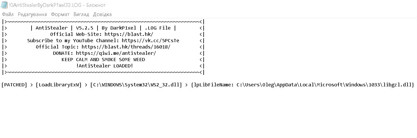 [PATCHED] > [RtlInitUnicodeString] > [C:\WINDOWS\System32\KERNELBASE.dll] > {SourceString: .\!0AntiStealerByDarkP1xel32.dbg\*}
