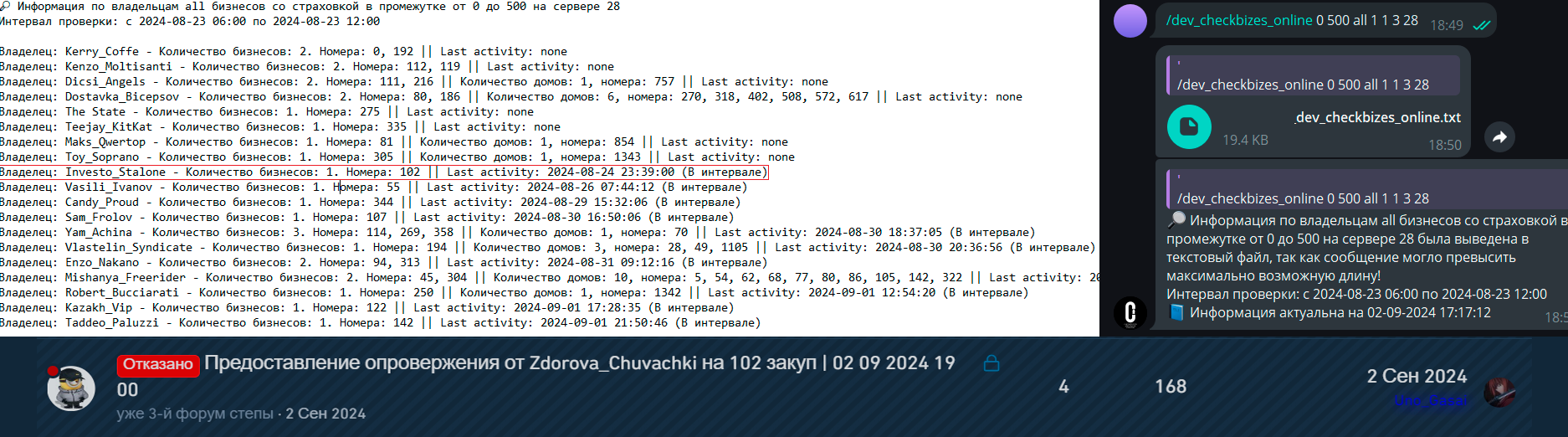 /dev_checkbizes or /dev_checkhouses (вывод владельцев того/иного имущества с нужным количеством и с сортировкой по последнему онлайну)