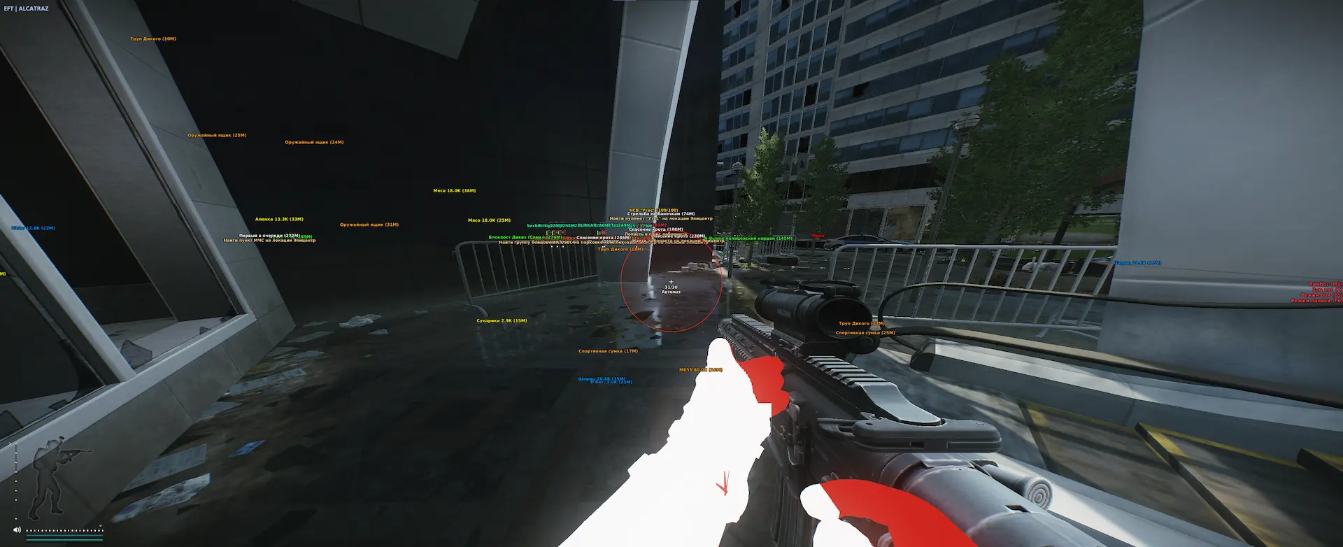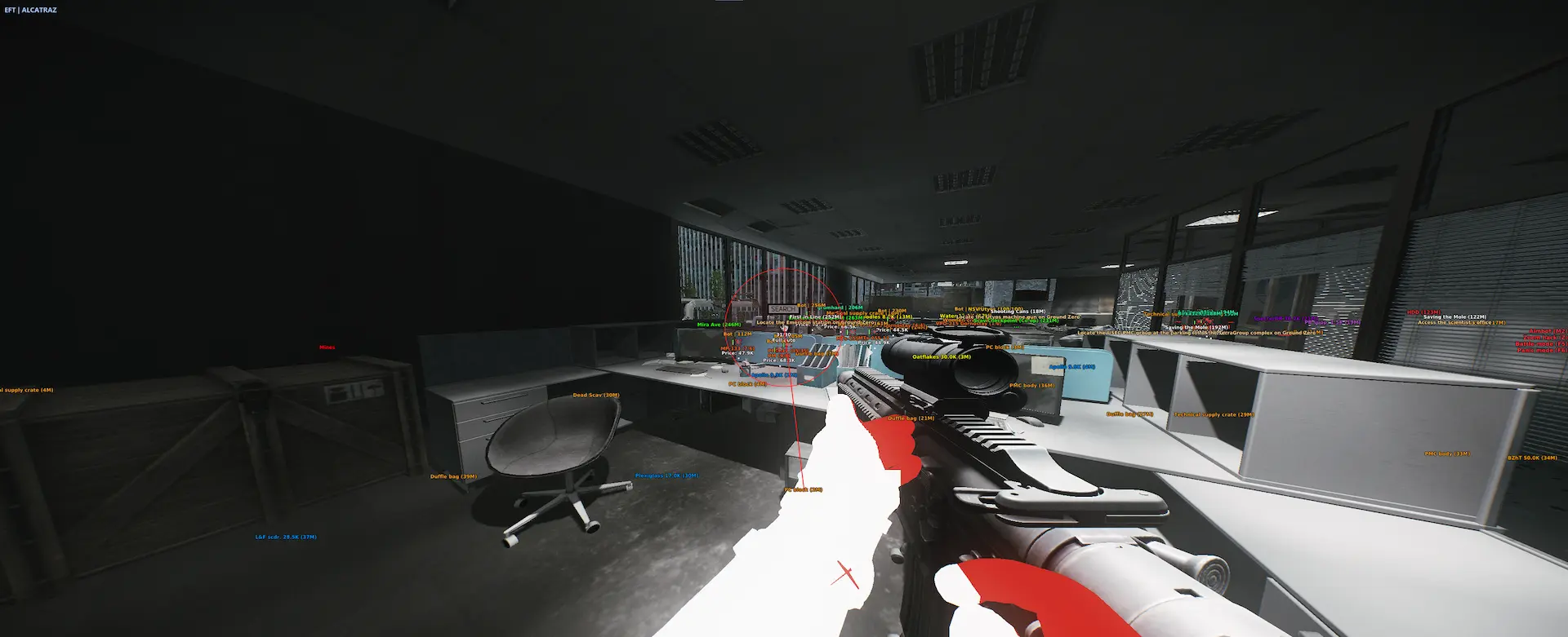 - Отображение лута: Показывает все ценные предметы в открытом мире Таркова, помогая вам быстро находить нужные ресурсы.