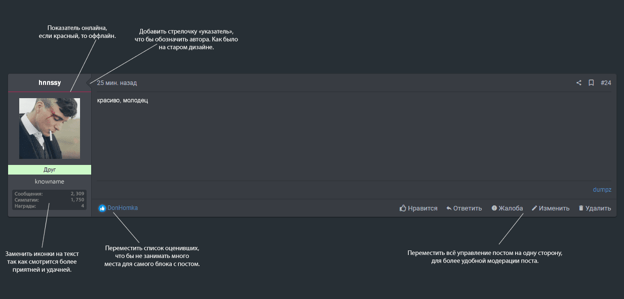 прямоугольные аватары в постах наверное всё же стоит сделать, насчёт показателя онлайна и надписей посоветуемся. перенос кнопки жалобы и реакций вызывает сомнения, т.к. на месте кнопки жалобы у модераторов много других кнопок, которые трудно впихнуть куда-то ещё, это наверное пока не будем трогать.
