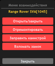 • Добавлено удобное меню взаимодействия на транспорт: починка (/repcar), заправка канистрой (/fillcar), взлом замка (/breakcar). Активация: подойдите вплотную к транспорту и нажмите X (по умолч.);