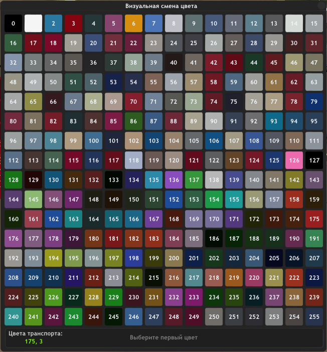 - Покраска транспорта стала легче, т.к. в ImGui окно вынесен вся палитра цветов для балончика (/balon [без аргументов]). Находясь в транспорте вы можете визуально покрасить его (той же командой).