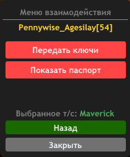 - меню взаимодействия с игроками (передача ключей, показ техпаспорта своего авто);