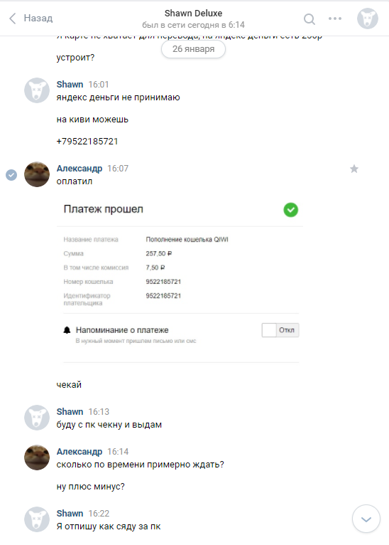 4. Купил подписку 26 января оплатил скинул дал ключ shawndeluxe ключ оказался не рабочим потом писал что тех работы, сказал что исправит 1 февраля что проблемы на хостинге написал разрабочитку чита он ответил что shawndeluxe уже не относится к ним .