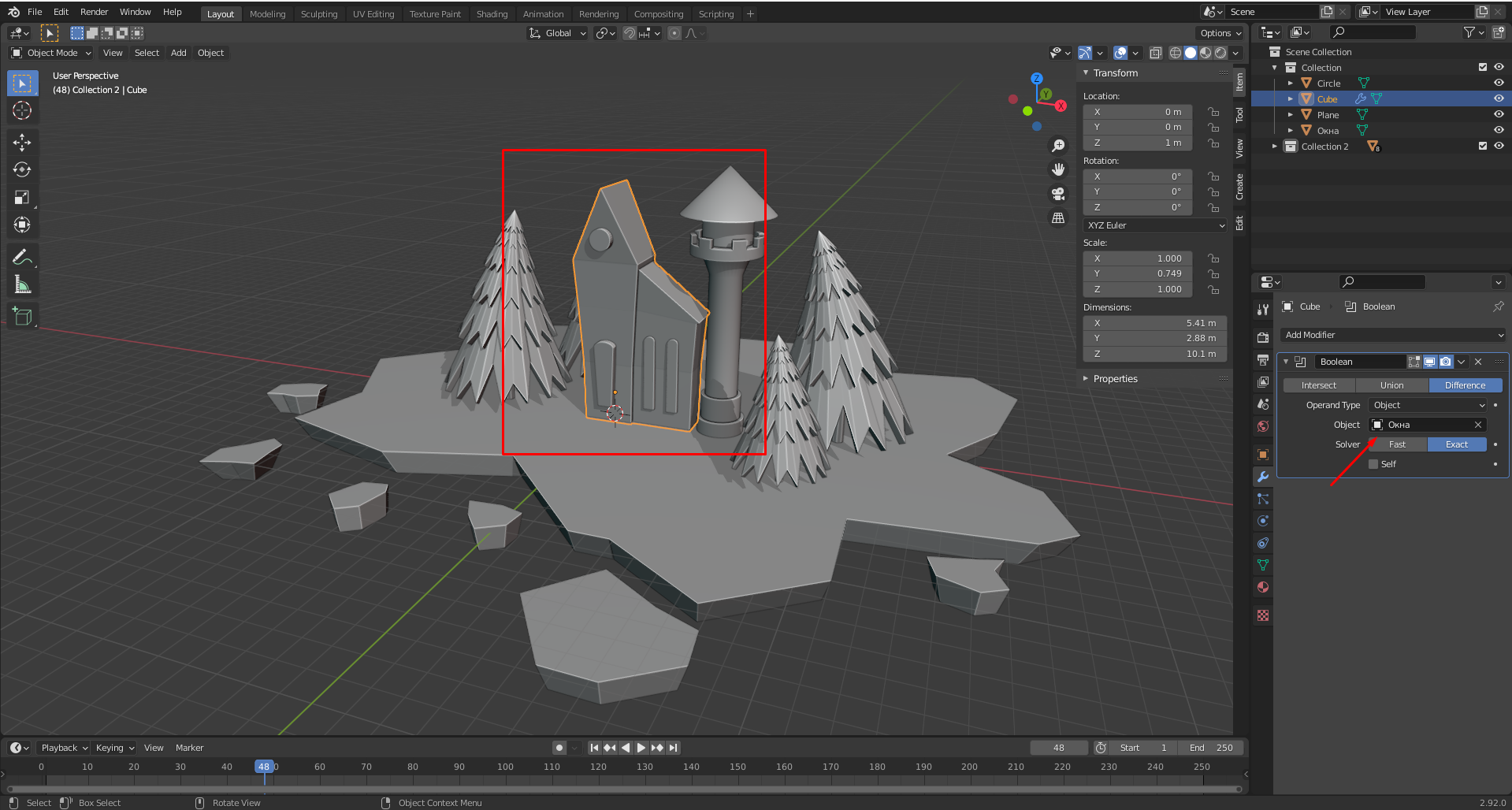 Создаю замок по видеоурок, и там нужно использовать булл на замок для вырезания окна.И после использования модификатора замок или пропадает или ничего не происходит, но если я пытаюсь использовать булл в другой сцене то все работает. С чем это может быть связано помогите пожалуйста.